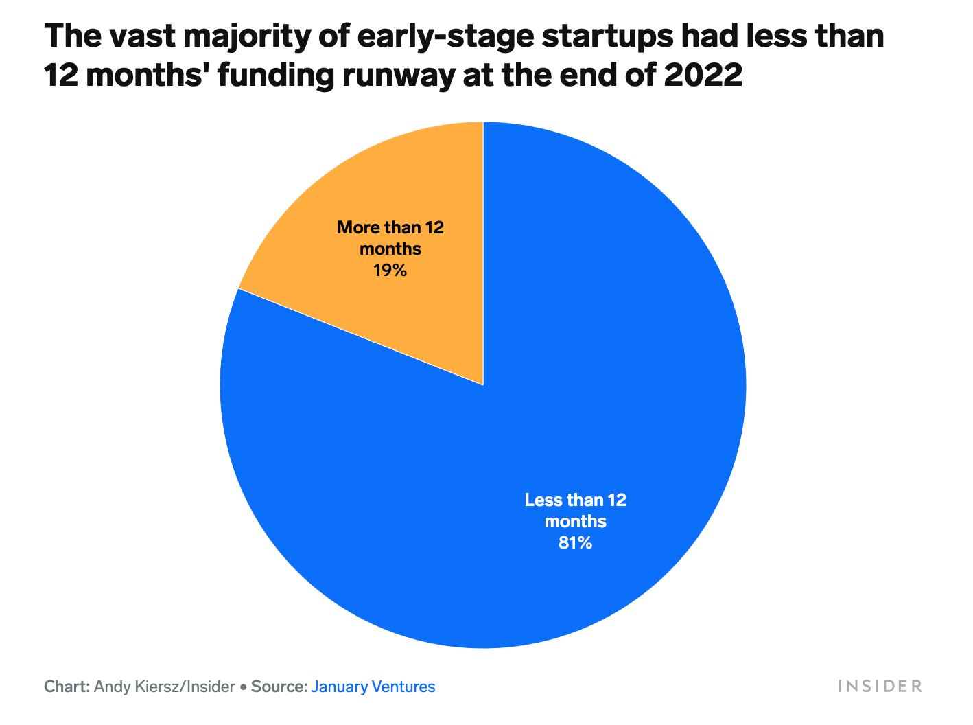 The worst is yet to come—there’s a lag effect at play, in which well-funded startups can survive with high burn for multiple quarters (or even years). We’re about to see many companies come back to market and be unable to raise capital. One report from Insider shows that most early-stage startups had less than 12 months runway at the end of 2022: