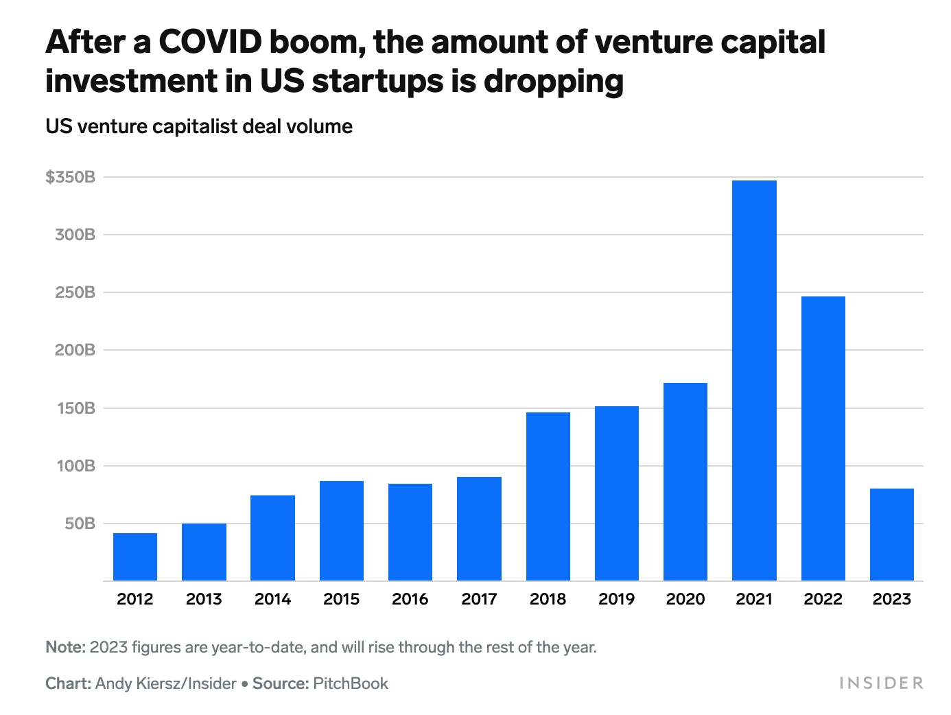 The venture world got ahead of its skis, and we’re seeing a necessary correction. Venture capital investment is down meaningfully in 2023: