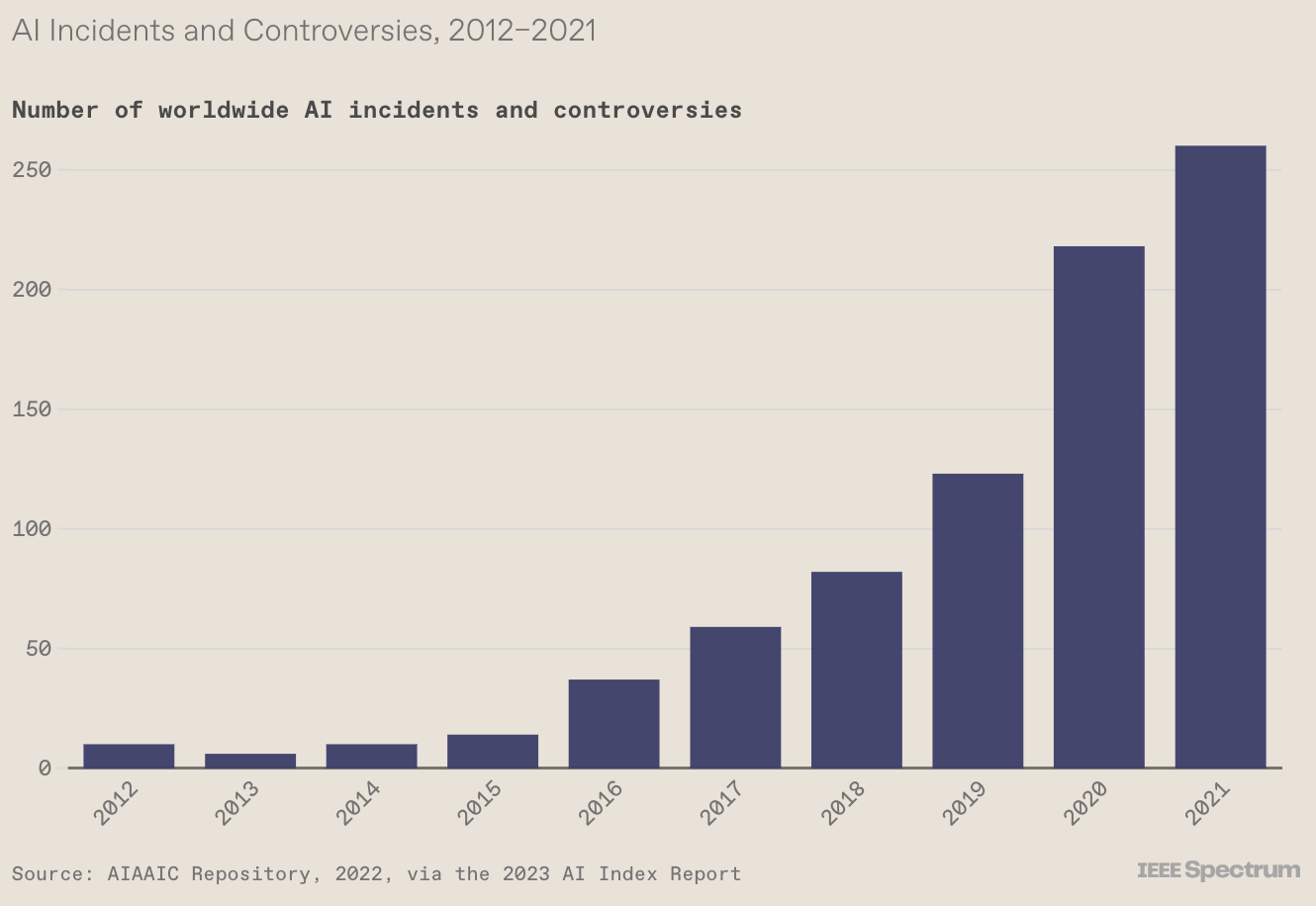 Alongside the rise of AI comes a rise in AI incidents and controversies. This chart chronicles the number of incidents concerning the misuses of AI. The data is about a year old, though it includes some incidents from 2022 like a deepfake of Ukraine President Volodymyr Zelenskyy surrendering and news that Intel had developed a system for monitoring student emotions over Zoom, a technology that raised privacy and discrimination concerns.