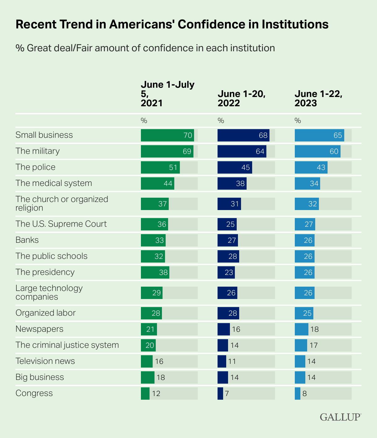 Related to confidence in higher education is confidence in institutions writ large. Americans’ confidence in institutions is down across the board:
