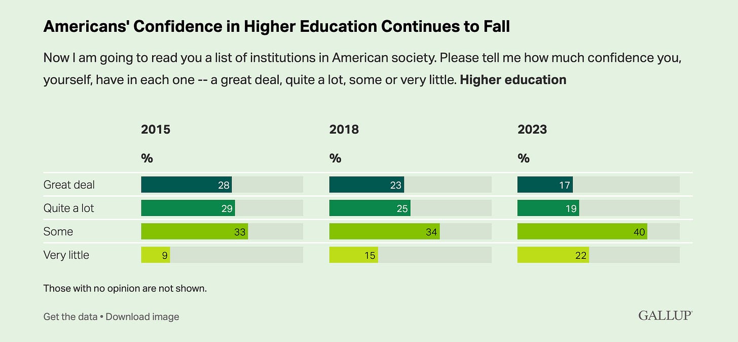 Americans are losing confidence in higher education. And that confidence is slipping fast: in 2015, 57% of Americans had a “Great deal” or “Quite a lot” of confidence in higher-ed; by 2023, that number was down to 36%.