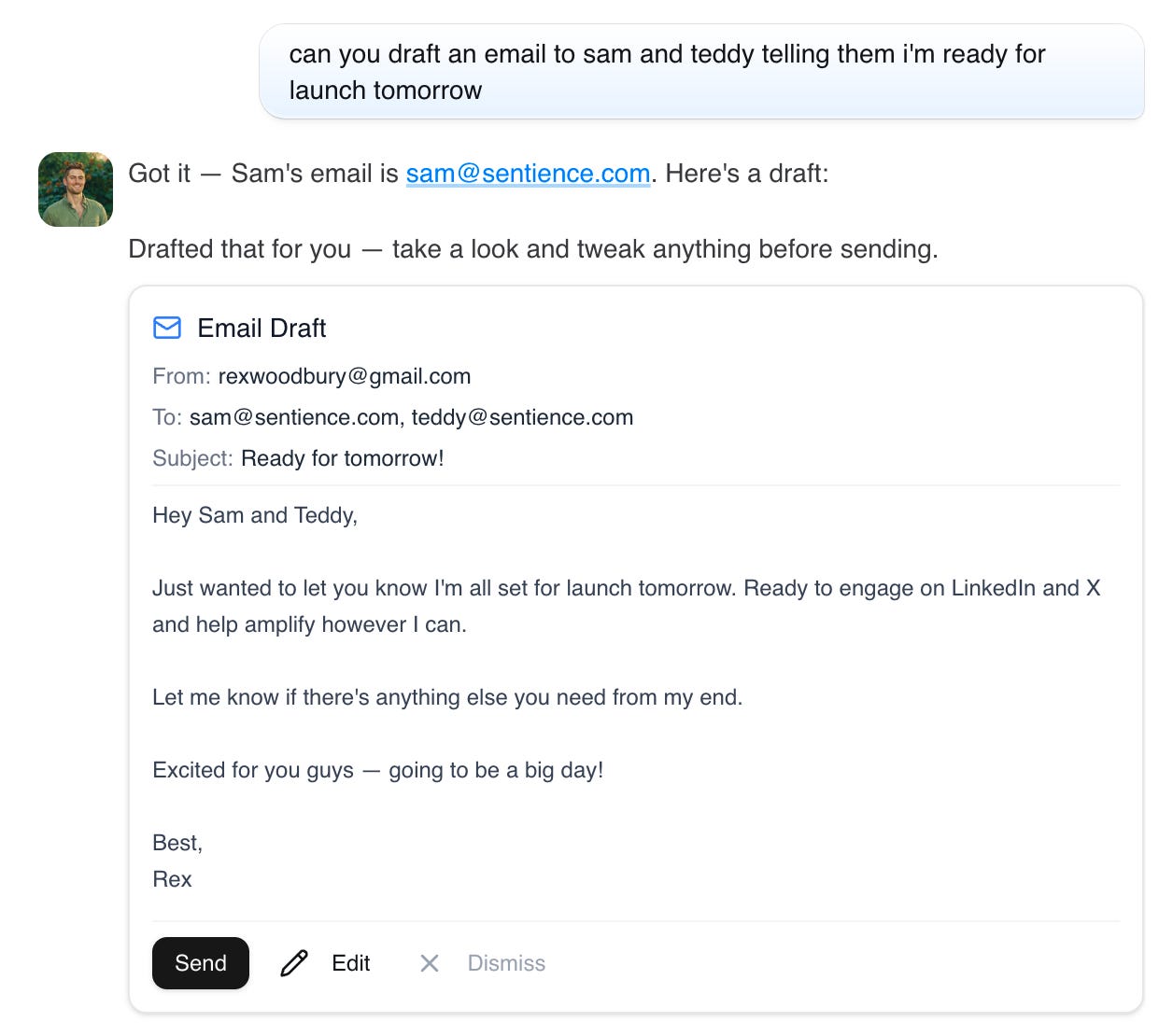 But I can also ask my Sentience to act on my behalf. Spinning up a response to Sam and Teddy takes two seconds: