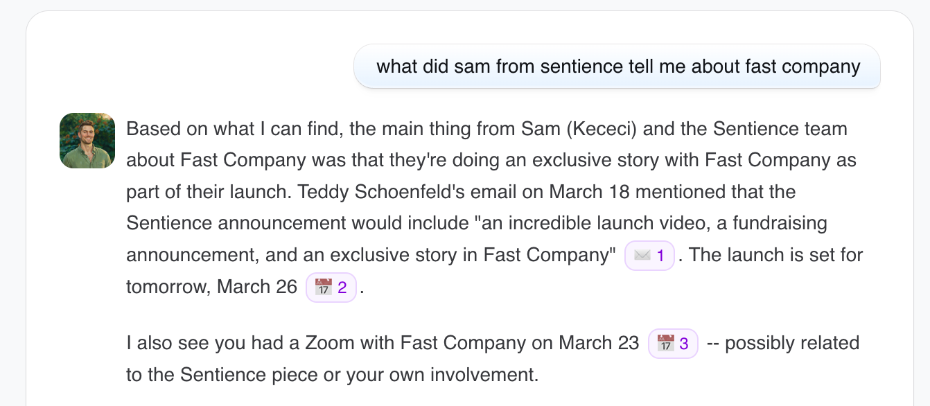I’ve been using Sentience for the past few months, and it’s become central to how I operate. The product works by first ingesting data: I’ve imported my email, calendar history, Slack threads, notes, and ChatGPT + Claude messages. This gives me a high-fidelity personal model that behaves… like me.