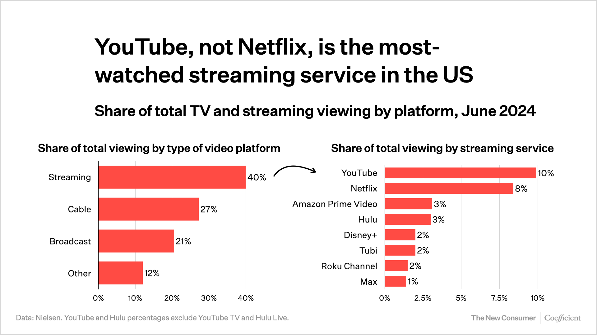 Speaking of YouTube: in my view, the best example for “Everything Is Television” is the rise of YouTube viewership…well, on a television. Netflix is a $415B streaming behemoth currently trying to gobble up Warner Bros Discovery. But Netflix isn’t even the biggest streamer on your TV! That would be YouTube: