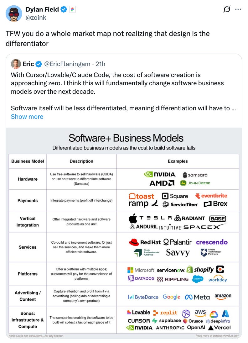 When the underlying tech gets commoditized, in this case software creation, we’re forced to rely on taste, which is much harder to automate. Or, as Dylan put it, design is the differentiator.
