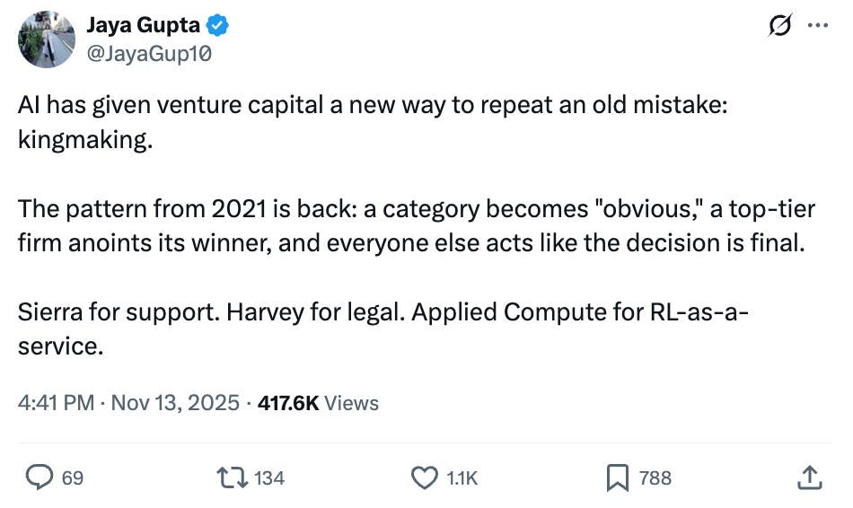 Same for startups. You want to replicate the lawyer saying “Are we using Harvey?” This is why Sandstone’s launch earlier this month was important, and why we wrote about it in The Year of Invisible AI. Sandstone needs to be synonymous with in-house legal AI. Every applied AI company should be thinking about how to articulate themselves clearly, crisply, and consistently. In a startup world that’s the equivalent to the 24/7 news cycle, how do you build a cohesive long-term narrative?