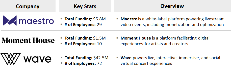 Three startups powering virtual concerts are Maestro, Moment House, and Wave: