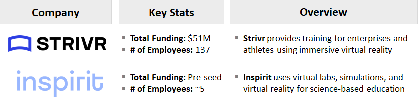 There are companies using virtual worlds for education, including Strivr and Inspirit: