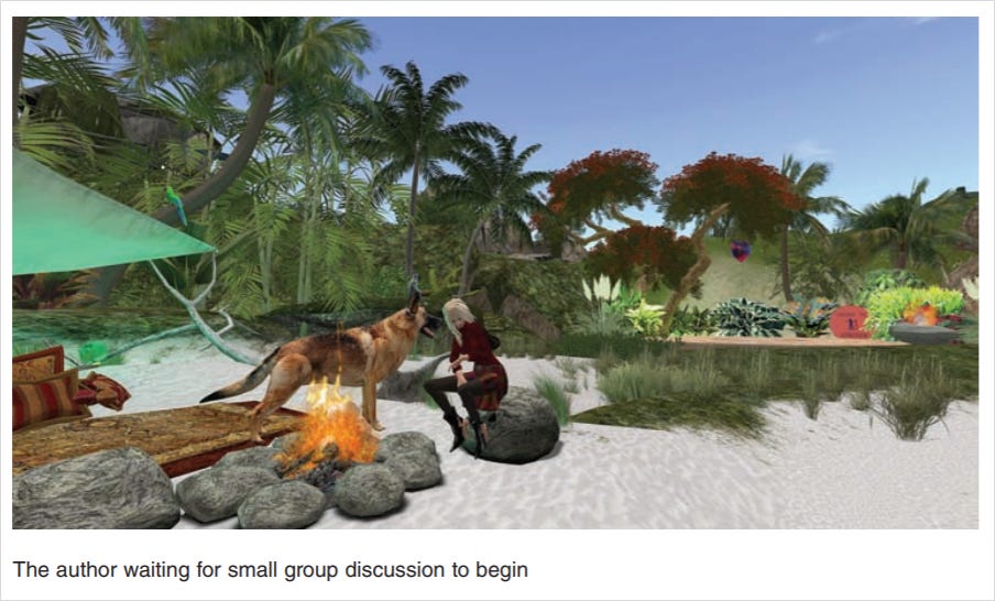 Dr. Estelle Codier is a 65-year-old retired nurse. She discovered Second Life back in the 2000s and saw an opportunity to teach real-world skills within the virtual world. Within Second Life, Dr. Codier led students on critical care rounds on virtual patients within a virtual hospital. She later published Teaching Health Care in Virtual Space, a guide to using virtual worlds for education, which includes this image: