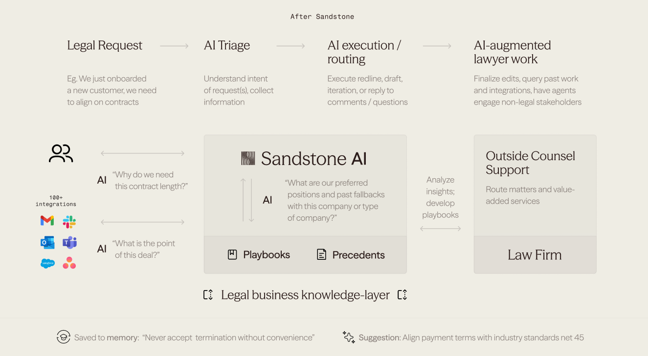 Sandstone is building AI for in-house legal. In-house legal is a roughly $30B global market (Source: McKinsey) and in-house is growing quite a bit faster than the broader law market. Tailwinds abound: companies are facing more complex regulatory landscapes; compliance demands seem to increase every year; and cost pressures incentivize moving legal spend in-house. Lawyers are also increasingly seen as central to strategic decision-making. There’s a reason why Gerry was always at Logan Roy’s side.